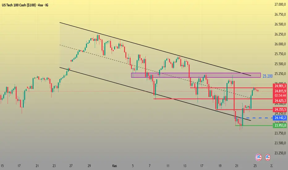 Dün Nasdaq, 24.300 seviyesindeki kanal alt bandından güçlü bir destek buldu ve buradan gelen tepkiyle hızla kanalın orta çizgisini geçti. Ardından 24.900 direncine kadar yükseldi. Bu seviyeden gelen satış baskısı sonrasında, fiyat kısa bir geri çekilme yaptı ve 24.800 seviyesine indi.