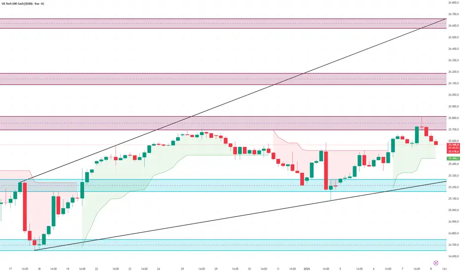 nasdaq üst drenc bölgesi olarak 25800 bölgesinden aldığı tepkisiyle birlikte satış baskılarını sürdürüyor alt destek nokltası olarak 25450 ve 25290 seviyelerini takip etmek yerinde olucaktır