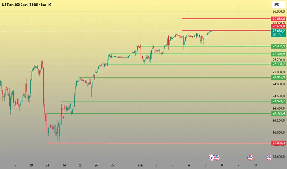 Grafiği incelediğimde, son 1 saatlik hareketlerde fiyatın yükseldiğini görüyorum. 25.690 seviyesine doğru bir hareket olmuş, bu nokta önemli bir direnç seviyesi olarak dikkat çekiyor. Eğer fiyat bu seviyeyi aşarsa, 25.883'e kadar bir yükseliş görülebilir. Bu seviyelerde dikkatli olmakta fayda var çünkü burası fiyatın daha önce zorlandığı bir bölge.
