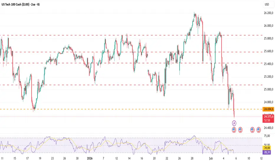 tech 100 endeksi şu sıralar 24.700 civarında dip bulmaya çalışıyor. rsi göstergesi 30 seviyesine yakın ve bu da piyasada aşırı satış (oversold) sinyali veriyor. teknik olarak kısa vadede bir toparlanma olasılığı artıyor.