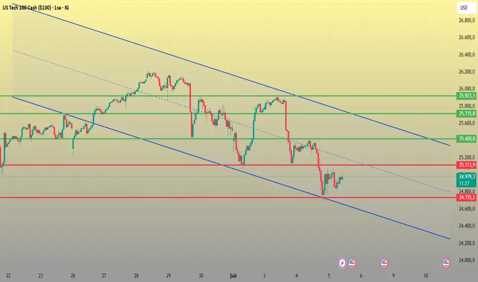 Nasdaq 100’de ana trend aşağı. Yukarı yönlü hareketler satış fırsatı, aşağıda ise 24.700 bölgesi kritik denge alanı olmaya devam ediyor. Trend değişimi için net bir kanal kırılımı ve güçlü kapanışlar görmek isterim.
