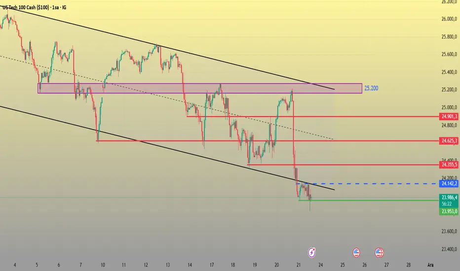 Bu satış dalgası, fiyatın ara destek oluşturmadan doğrudan kanal dip bölgesine doğru geri çekilmesine neden oldu. Şu anda 24.000 seviyesi test ediliyor. Bu bölge, kısa vadede yön tayini açısından oldukça kritik.