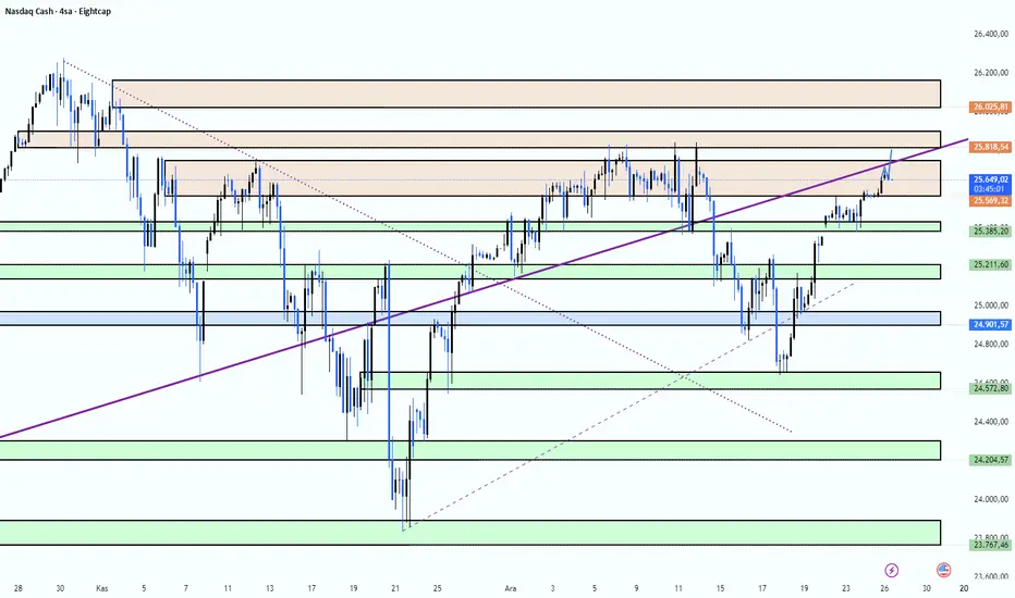 Fiyatın 25.818,54 direnç seviyesine kadar yükselerek bu bölgeyi test etmesi, ardından 25.569,32 destek noktasına doğru geri çekilmesi olası görünüyor. ⚖️