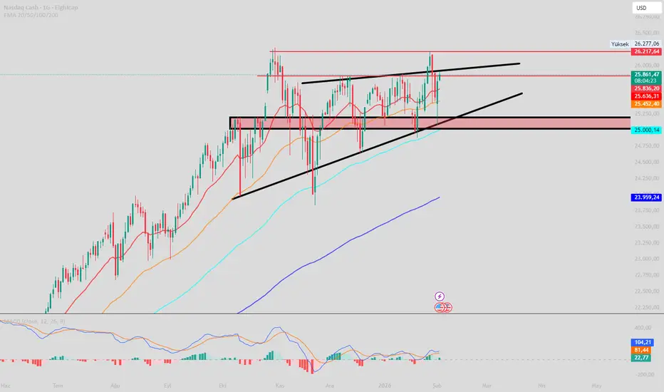 Nasdaq grafiğine baktığımızda fiyat 25865 seviyelerinde olduğunu görüyoruz. Bu seviye aynı zamanda yükselen kamanın direnç seviyesi.