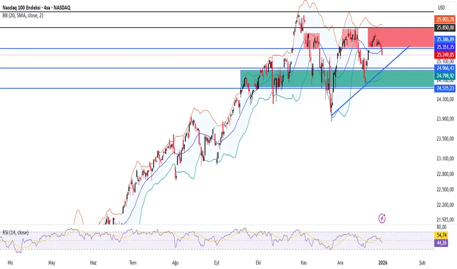 Nasdaq100 grafiğini H4'te incelediğimizde 25400 Bollinger orta band seviyesinin altında fiyatladığı görüyoruz. Bu seviye altında kaldığı sürece ilk hedefin 24970 destek seviyesi olduğunu söyleyebiliriz. Bu seviyeyi tekrar test edebilir. Bu seviyenin altında kalıcılık sağlarsa yeşil boyalı kanal içerisinde kendini bulabilir. 24535 ile 24970 arasında bir kanal oluşumu görebiliriz.24535 seviyesinin altına inerse düşüş daha da derinleşir ve 23950 seviyelerine kadar sert düşüşler görülebilir. 24970 seviyesinin üzerinde kalıcılık sağlarsa tekrar 25400 seviyelerine kadar yükseliş görebiliriz. Bu seviye üzerine çıkarsa 25850 direncine kadar yükselişine devam eder.
