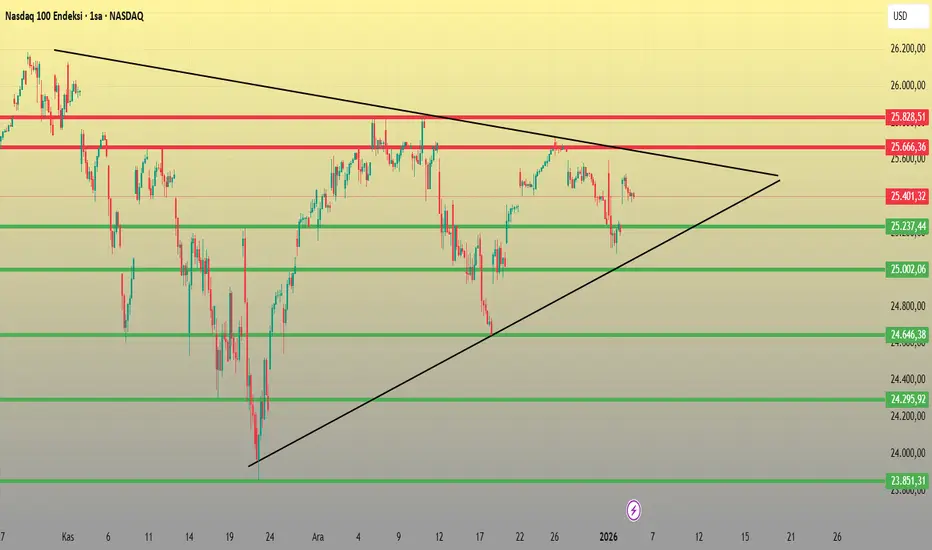 Nasdaq 100 endeksinin 1 saatlik grafiğine baktığımda, fiyatın çizdiğim formasyon içinde hareket etmeye devam ettiğini ve destek–direnç seviyelerine net tepkiler verdiğini görüyorum. Üst trend çizgisiyle birlikte 25.666 – 25.828 bandı güçlü bir direnç alanı oluşturmuş durumda. Bu bölgeden gelen satışlarla fiyat yönünü aşağı çevirdi.