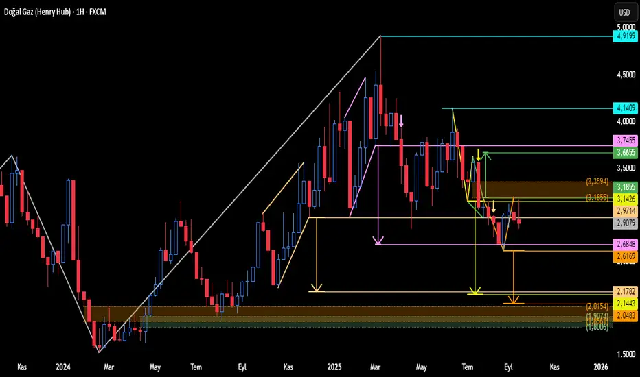 Haftalık zaman diliminde olan ana grafiğimizde 4 tane düşüş formasyonu, 1 tane yükseliş formasyonu mevcut ve bu düşüş formasyonlarından üçü Sell sinyali üretmiş,pembe renkli formasyon hedefine ulaşmıştır. Sarı renkle görülen düşüş formasyonu ve çok geçmişte oluşan krem renkli düşüş formasyonun da sell sinyalleri aktif...Turuncu renkle görülen düşüş formasyonu ise 2.617 altında olabilecek haftalık mum kapanışıyla Sell sinyali üretecek... 3.185 üzerinde olabilecek haftalık mum kapanışında ise AL sinyali oluşacak ve bu formasyonun ana hedefi 3.665 olacaktır...Aktif olan sarı renkli düşüş formasyonunun ana hedefi 2.144, krem renkle görülen, yaklaşık 10 ay önce oluşan düşüş formasyonunun hala iş yapıp yapmayacağından emin değilim ama, sinyali aktif olan o formasyonun hedefi de 2.178'dir...