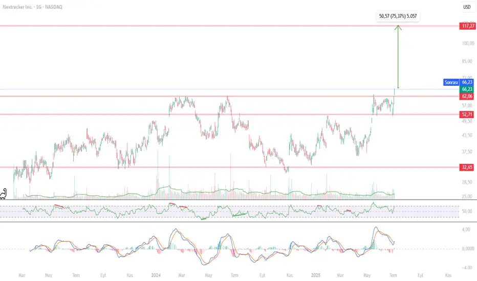 Nextracker Inc. hissesi, haftalık periyotta güçlü bir kırılım sergileyerek 61,71 USD seviyesindeki yatay direncin üzerine çıktı. Bu direnç, son 12 ayda birkaç kez test edilmiş ancak geçilememişti. 3 Temmuz 2025 tarihli kapanış, bu seviyenin üzerinde gerçekleşerek teknik anlamda yükseliş sinyali verdi.