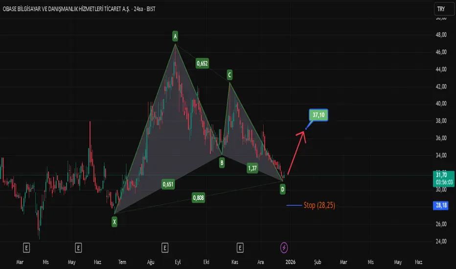 Kullanmış olduğum "Harmonic Patterns with Potential Detection" indikatörü #OBASE hissesinde Bullish Gartley Harmoniği tespit etti. Harmonikler grafikler üzerinde güze çalışan formasyonlardır. Dipte oluşmuş bir Harmonik'te fiyat yukarı doğru hareket eder. Buradaki Gartley Harmoniği de dipte oluşmuş ve devamında yükseliş beklenmektedir. Hedefi 37,10 ₺'dir. Stop kullanmak isteyenler 28,25₺'yi stop noktası olarak kullanabilirler.
