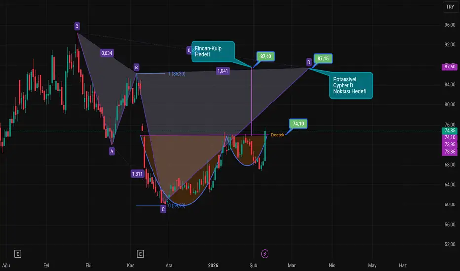 ONRYT hissesinde; Potansiyel Harmonik Cypher Pattern ve Fincan Kulp Formasyonu ihtimali bulunmaktadır. Her iki formasyonun da olası hedefleri aynı bölgede olup, 87 ₺ civarıdır. Fiyatın hedefe gidebilmesi için 74,10 ₺ desteği üzerinde kalması önemlidir.