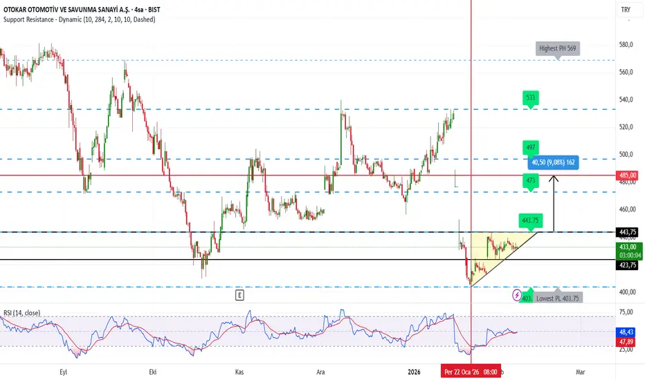 Yükselen üçgen formasyonu mevcut. 443,75 üzeri Kapanışta. Formasyon AKTİF olur.