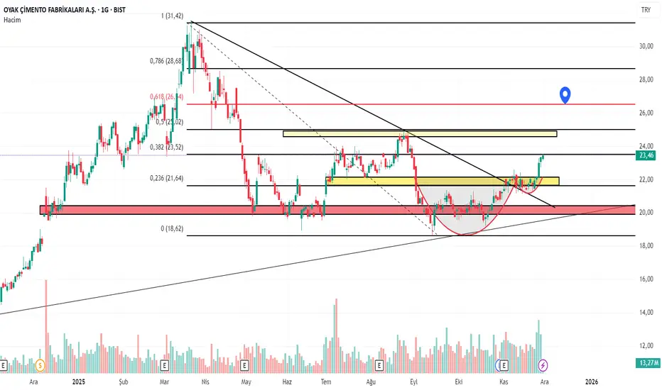 düşüş sonrası dönüş formasyonu olan çanak kulp u geçen oyakc 24.92 direnci geçmesi halinde son zirvenin 0.618 i olan 26.56 hedefine gitmek isteyecektir .
