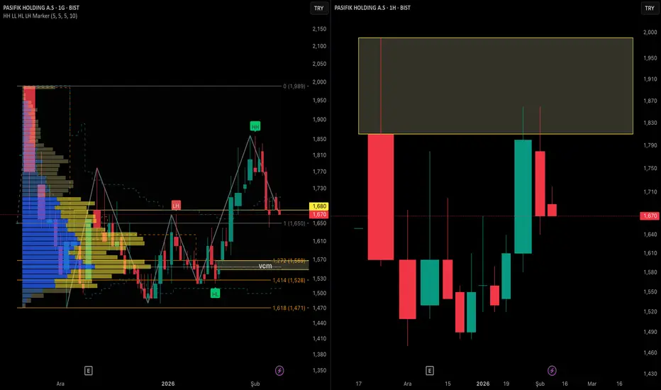 birkaç günlük tavan sonrası hacimli bir satış mumu ,sonrasın 1.618 inversiyon bölgesinden tepki, çok geçmişi olmadığı için günlükte yön dönmüş görünüyor. altta küçük bir gap alanı mevcut. buranın kapatılacağını öngörüyorum.haftalık bakıda sarı kutucuk yüksek yoğunluklu satıcı alanını gösteriyor. uzun vadede çoğu kimsenin beklentisi büyük.ama kısa vadede de hızlı hareketler olabileceğini düşünüyorum.grafik görünümü güzel.izleyelim görelim.ytd