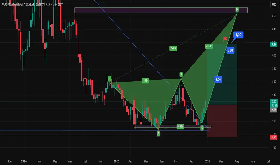 Bugün portföye ekleyeceğimiz bir başka hisse PARSN makina an itibari ile fiyatı 100TL (2,30$) teknik olarak incelediğimizde mayıs 2024 tarihinde başlayan 4,26$ fiyat bandından kar satışları ve düşüşlerin akabinde Aralık 2025 tarihine geldiğimizde 1,92$ seviyelerinden düzeltmenin tamamlandığını ve haftalık USD bazlı grafiğimizde güçlü bir momentum ile gerçek bir trend oluşumuna doğru hareket ettiğini ve hacimsel artışların PARSN hissesinde haftalık periyotta pozitif yönde fiyat hareketliliklerinin önümüzdeki haftalarda gerçekleşeceğini ve sıralı hedefler olarak grafikte belirtmiş olduğum 2,64-3,08-3,28$ sıralı hedefleri kısa ve orta vadede beklenile bilinir.