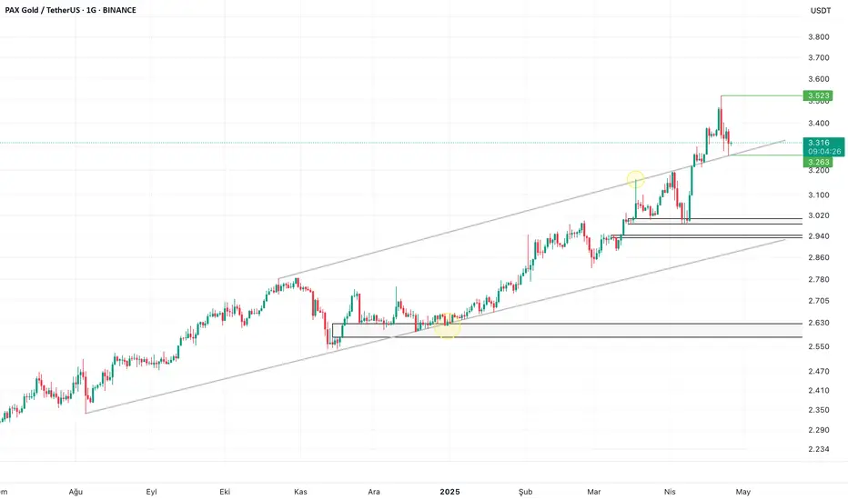 3263$ altında kapanışlar 3050$ lar seviyesine düşüşler getirebilir. Burada takip edilmesi gereken trend çizgisini grafikte gösterdim. Çizginin altında kapanışlar PAXG için dinlenme evresine geçişin teyidi olacaktır.