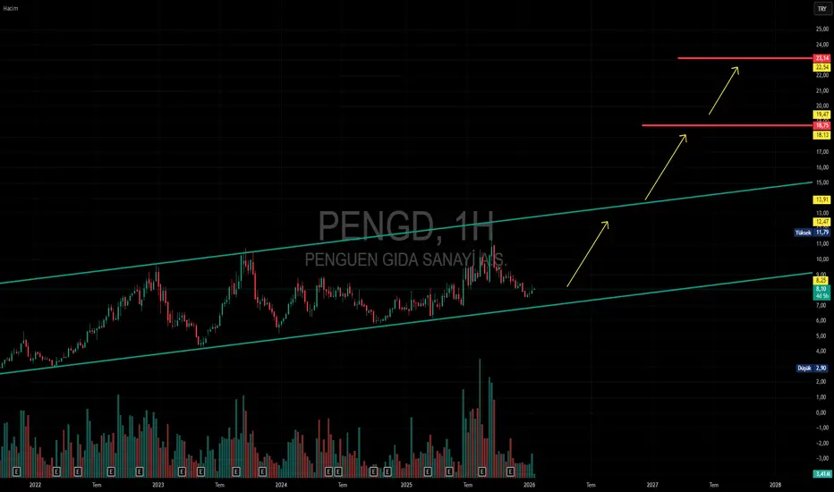 PENGD grafiği incelendiğinde, fiyatın ana trendin dip bölgelerine oldukça yakın bir alanda dengelendiği görülüyor. Bu bölge, teknik açıdan tepki alımlarının sıklıkla izlendiği ve orta vadeli hareketlerin başladığı alanlar arasında yer alır.