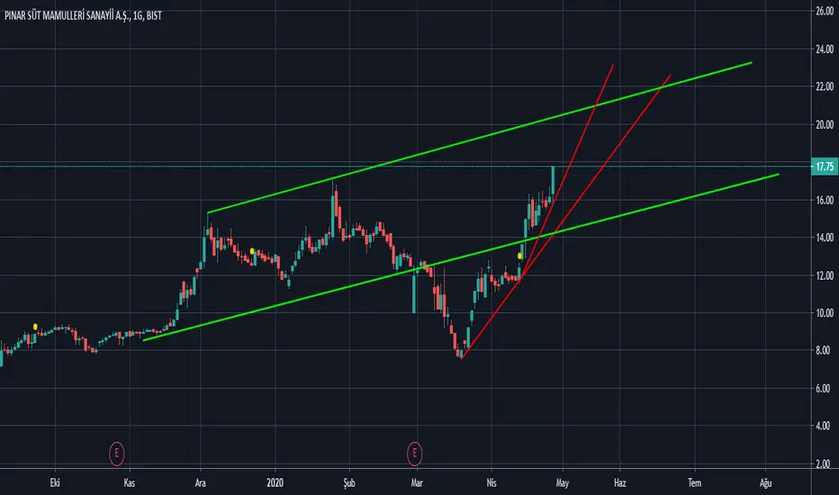 Yükselen bir trendimiz mevcutmuş. Hissemiz trend içinde düşmeye başlamış. Corona şokuyla yükselen kanalı aşağıya kırmış. (ki böyle beklenmedik durumlar ihlal olarak adlandırılır.) Kısa sürede de kanal içerisine tekrar girmiş. Kırmızı çizgiler ile belirtilen stop çizgilerini kırmadığı sürece kanal üst bandını hedeflemesi beklenebilir.
