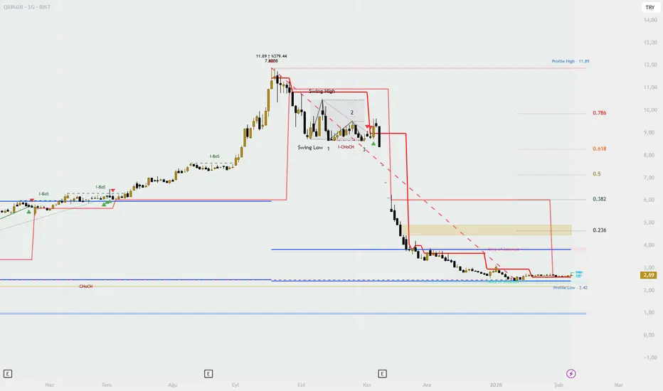 QUAGR hissesi 2,69 TL seviyesinde işlem görüyor. Hisse, son bir yıl içinde 11,89 TL zirvesinden %75’in üzerinde değer kaybı yaşayarak sert bir düşüş trendi oluşturdu. Bu tarz düşüşler sonrası “dip mi?” sorusu sıkça sorulsa da, grafik hâlâ temkinli okunması gereken bir yapı sunuyor.