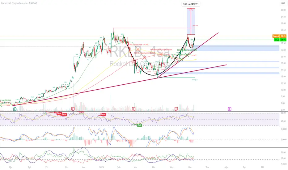 Yüklenen 4 saatlik Rocket Lab (RKLB) grafiğine dayanarak güncellenmiş bir analiz sunuyorum. Teknik göstergeler olarak kırmızı 200 MA (Hareketli Ortalama), sarı 144 MA ve yeşil 50 MA'ya odaklanalım. Şu an (09 Haziran 2025, 15:38 +03) fiyat, 18-20 USD aralığında bir destek bölgesinde bulunuyor. Fiyat, kırmızı 200 MA'nın altında bir düzeltme yaşadıktan sonra yeşil 50 MA ile sarı 144 MA'nın üzerinde bir toparlanma sinyali veriyor. 50 MA, kısa vadeli yükseliş trendini desteklerken, 144 MA orta vadeli bir direnç olarak 20 USD civarında etkili. 200 MA ise uzun vadeli trendi yansıtan 23 USD destek seviyesine yakın bir taban oluşturuyor. RSI nötr bölgede, MACD ise yakın zamanda kesişme sinyaliyle yükseliş momentumu gösterebilir. 27-30 USD bandındaki direnç kırılırsa, bullish bir trend başlayabilir.