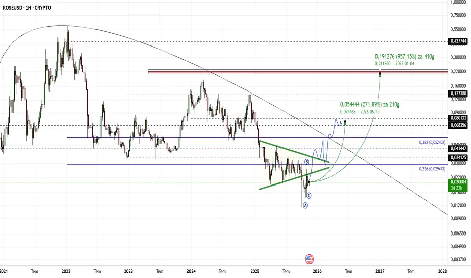 Rose için 2026 hedefim. aralık ayı ile başlayacak olan yükselişin ulaşmasını beklediğim seviyeleri belirttim grafikte. rose hareketleri oldukça pozitif. sıyrılması gereken seviye yeşil üçgen içinde start verilir. haftalık grafik olduğu için zamanla akışa göre güncellemeler geçerim.