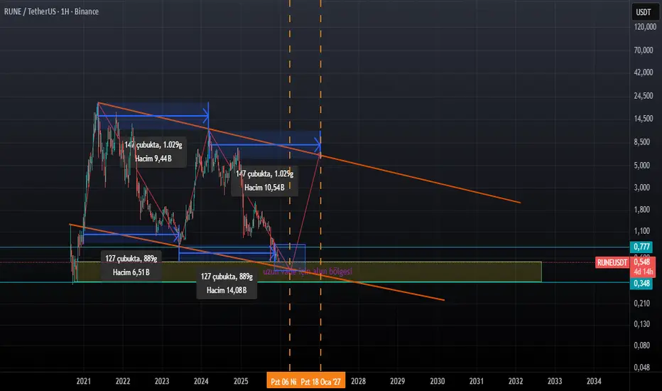 Görmüş olduğunuz grafik kripto piyasasında uzun vade bekleyişlerinin yani at sepete bekle mantığının pek de faydalı olmadığının bir kanıtı aslında. Vaktinde alınıp vaktinde satılan her türlü emtia, hisse senedi, kripto vb. yatırımlar yıllardır süregelen bir zaman cycle içinde para kazandırdığını gösteriyor. Burada da gözüme çarpmış lan Thor koinin hangi zamanda kazandırıp hangi zamanda kaybettirdiğini görebiliyorsunuz. Piyasa para kazanmanın vaktinin geldiğini anlamak biraz zor. Bazen iş işten geçtikten sonra farkına varırız. Ancak grafiğe baktığımız zaman para kazanma vaktinin geldiğini görebiliriz (Extreme bir durum olmaz ise). Grafikten artık satım zamanın değil alım zamanının geldiğini görebilirsiniz. Belirlediğim bölge eğer zaman döngüsünün olağan çalışması durumunda artık alımların yapılmasının ve ilerisi için beklemeye başlanmasının zamanının geldiğini gösteriyor. Yukarıda da belirttiğim gibi döngünün bozulmadığını varsayarsak yakın zamanda ayı sezonundan çıkılacağının bir işareti bu bölge. Bilgi ve merhamet sizinle olsun. Açgözlülük düşmanınız. Bol şans.