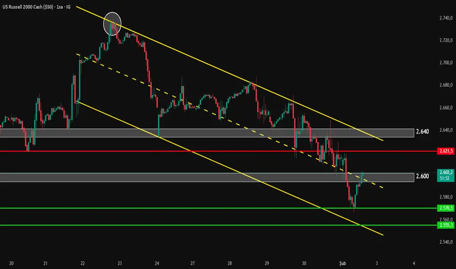 Grafiğe baktığımda, fiyatın yaklaşık 10 gündür düşüş yönlü paralel kanal içinde hareket ettiğini görüyorum. Fiyat en son kanalın üst bandına kadar yükseldi ancak burayı direnç olarak çalıştırarak tepki aldı. Bu tepkiyle birlikte 2.640 direnç bölgesinden düşüşe geçti. Daha sonra kanalın orta çizgisine kısa süreli tepki verse de 2.600 destek seviyesini kaybetti ve kanalın alt bandına sarktı. Bu düşüş, kanalın en dip seviyelerine denk gelen 2.570 bölgesine kadar devam etti.