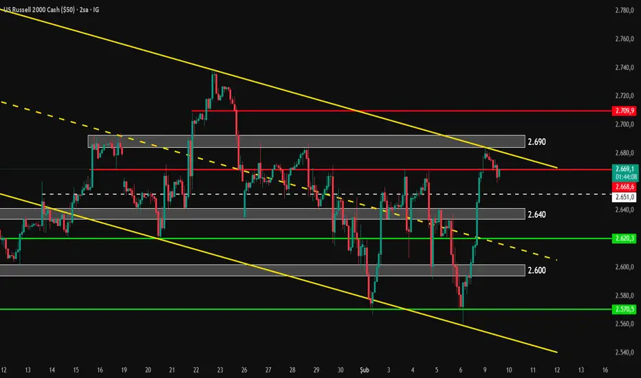 Fiyat yaklaşık iki haftadır sarı paralel kanal içinde hareket ediyor. Kanalın üst bandındaki 2.690 direncinden tepki aldıktan sonra 2.670 seviyesinin altına geriledi ve şu anda 2.650 desteğine doğru ilerliyor.