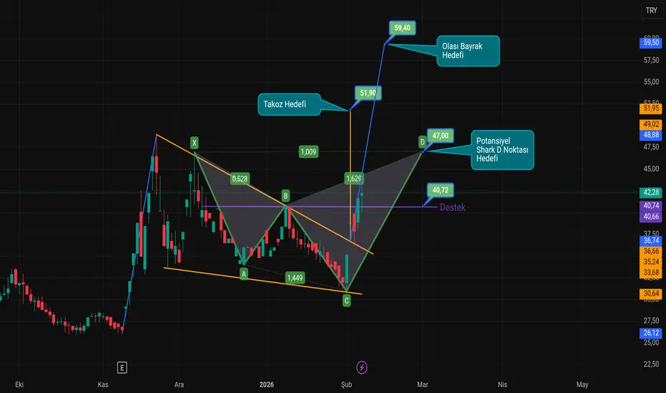 SANEL hissesinde; 47,00 ₺ hedefli Potansiyel Harmonik Shark Pattern ihtimali bulunmaktadır. 40,72 ₺ direncini bu hafta kırarak desteğe dönüştürmüştür. 37,00 ₺ civarında Takoz Formasyonu oluşmuş olup, teknik analize göre onun hedefi de 51,90 ₺'dir. Takoz oluşumu öncesindeki dik yükseliş aynı zamanda bir bayrak Formasyonu ihtimalini doğurmuştur. Teknik analize göre onun olası hedefi de 59,40 ₺'dir. Fiyatın hedeflere gidebilmesi için 40,72 ₺ desteği üzerinde kalması önemlidir.