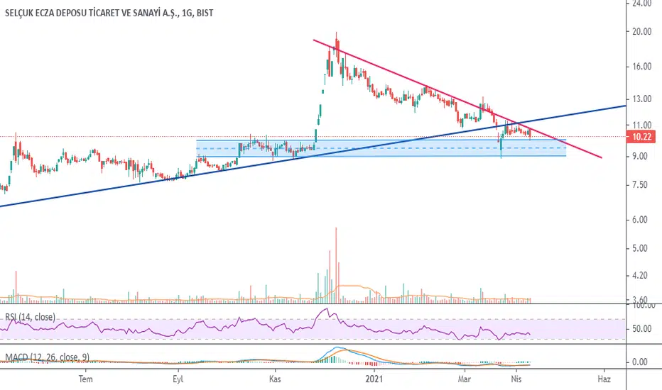 2019 yılından gelen yükselen trend çizgisi altında 3 haftadır kalmaya devam ediyor. Kasım 2020'de yaptığı sert yukarı hareketin başladığı yer olan grafikte mavi bantla gösterilen 10.08-9.04 aralığı, güçlü bir talep bölgesi olup, son 1 ay içinde 2 defa test edilip tepki görmüş.
