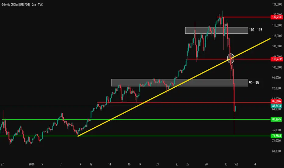 Silver için 2 saatlik grafikte yaptığım analizde, fiyatın uzun süre yükseliş trendi içinde hareket ettiği görülmektedir. Bu süreçte fiyat 120 seviyelerinin üzerine çıkmış, ancak bu bölgeden gelen direnç nedeniyle yönünü aşağı çevirmiştir.