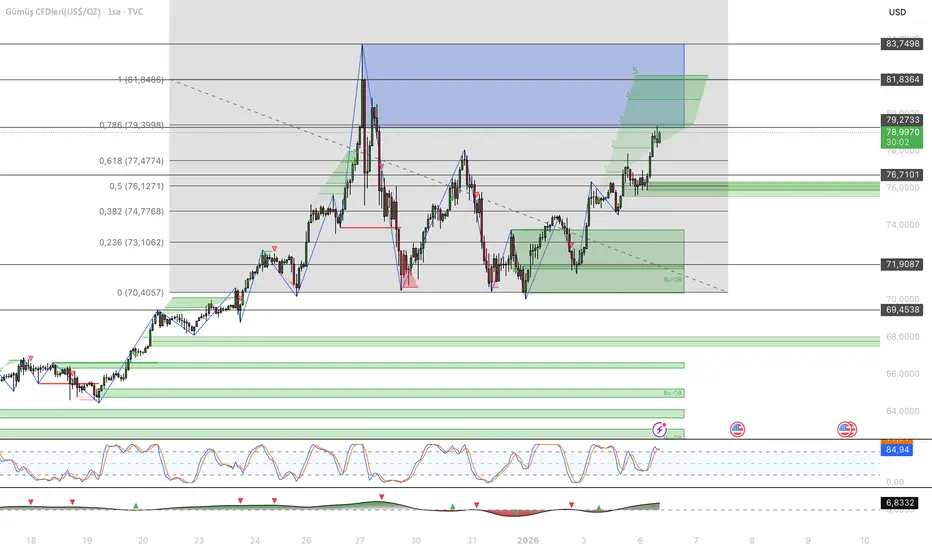 #SILVER Fiyat 76.70 – 77.50 bandını net şekilde kırdı ve bu bölge artık destek olarak çalışıyor.