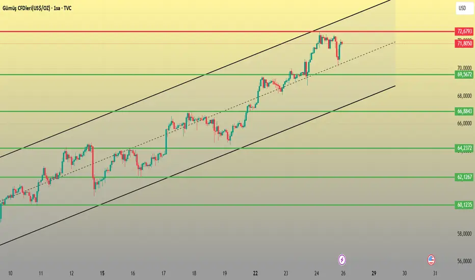 Analizime göre gümüşte yükselen kanal yapısının korunduğunu net şekilde görüyorum. Fiyat 70 dolar üzerini kırdıktan sonra yukarı ivme hızlanmış olsa da, 71,80 – 72,70 bandında güçlü bir direnç bölgesi oluşmuş durumda. Özellikle 72,67 seviyesi kısa vadede aşılması gereken ana eşik.