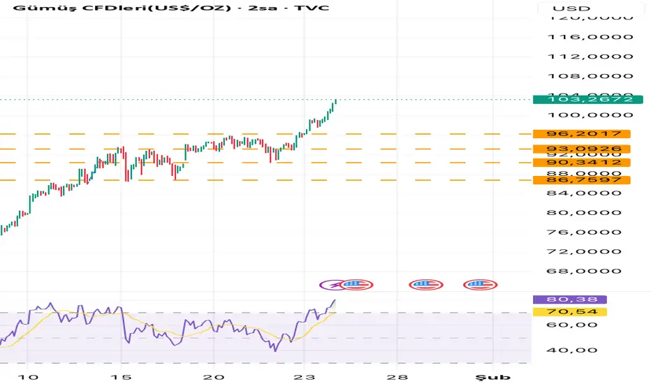 🔹Teknik tarafta ana trend hâlâ net şekilde yukarı. Daha önce güçlü direnç olan 90–95 bandı artık majör destek konumunda. Momentum çok güçlü, RSI aşırı alım bölgesinde ama bu zayıflık değil, trend gücünün bir göstergesi. Yine de bu bölgelerde sert ama kısa süreli düzeltmeler şaşırtıcı olmaz.