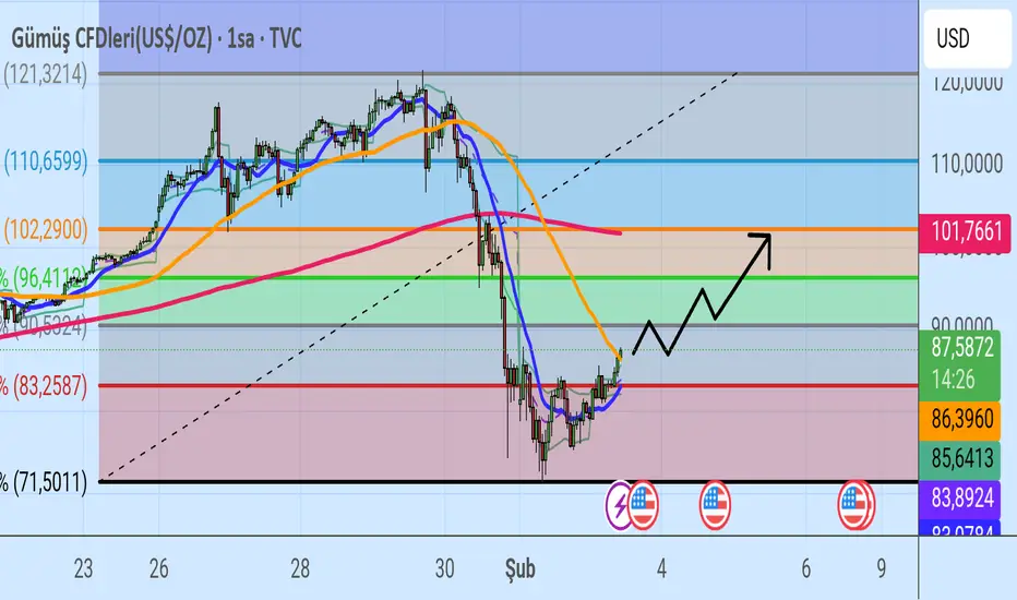 Silver son dip tepe arasi fibonacci cizimi.hareketli ortalamalara gore senaryo.
