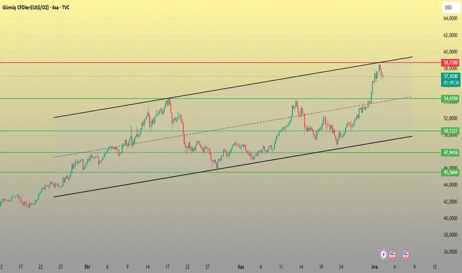 Gümüş, kanalın üst bandı olan 58.7380 seviyesinden reddedildi ve ilk durak olarak 57.00 desteğinde dengelenmeye çalışıyor. Bu bölge kısa vadeli yön için belirleyici.