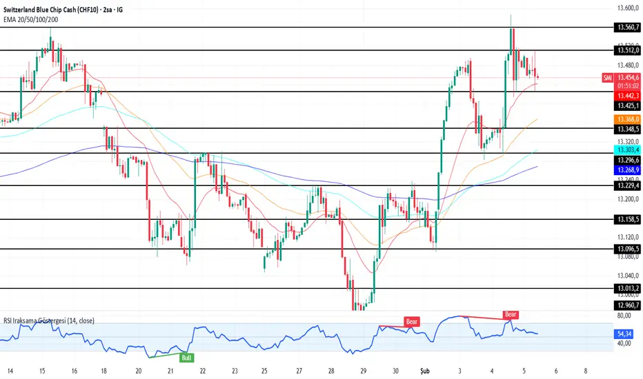 isviçre endeksine saatlik baktığımızda Fiyat güçlü yükseliş sonrası 13.560 tepesinden geri çekilerek 20 ve 50 EMA arasında dengeleniyor. Kısa vadede 13.425 yatay desteği önemli; altına sarkma 13.368–13.320 bölgesine düzeltme getirebilir. Yukarıda 13.520 / 13.560 bandı net direnç. RSI 55 seviyesinde, momentum nötr-pozitif. Hacim zayıf, bu yüzden kırılım gelmeden yön iddialı değil. Trend bozulmadı, sadece soluklanıyor.
