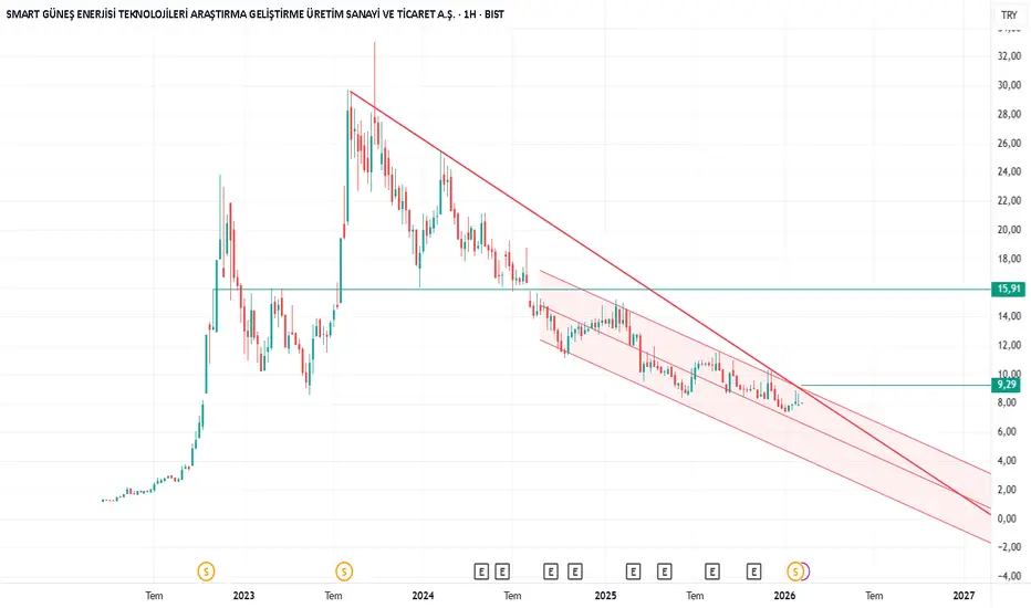 Düşen Ana trend altında , düşen bir kısa vadeli kanal ile takip ettiğimiz SMRTG hissesinde 9 şubat ile 8 liradan işlem görmekteyiz.