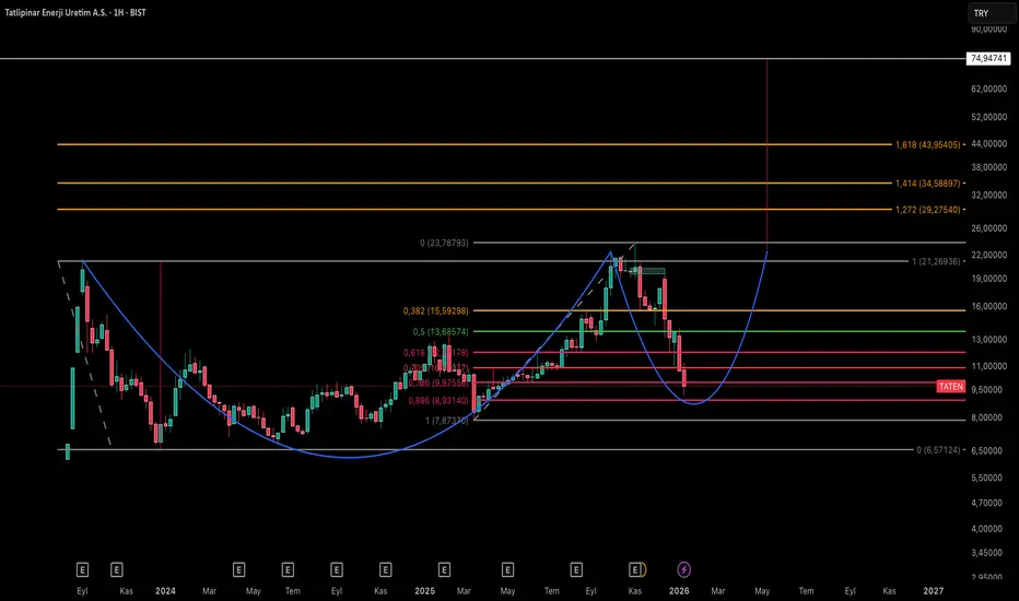fincan kısmı tamamlandı.ilk yükseliş zirvesini test etti. zirvenin üstü kırılımda fib 1.272-1.414,-1.618 sıralı hedefler.ilk zirvesi 21.27 üzerinde kapanış yaptı. bu seviyeleri tekrar zorlayıp üstüne çıkacağını düşünüyorum. son yükseliş dalgasında geri çekilme güzel bir bölgeye oldu. Henüz yukarı yöne gideceğine dair herhangi bir emare bulunmuyor.7.87 tl altında kapanışlar negatif yönü teyit etmiş olur.bu bölgeden önceki dönüşlerde 14. tl üzerinde günlük hacimli kapanışlarda yukarı yönlü hareketi teyit edecektir. burada da kulp formasyonu tamamlanacak olursa hedef seviyeyi görmektesiniz.izleyelim görelim.ytd