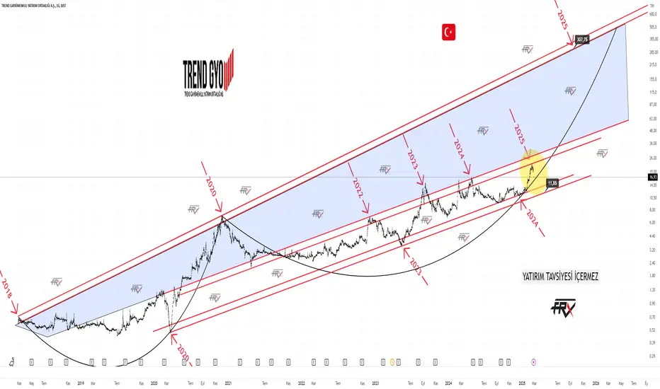 Trend Gayrimenkul Yatırım Ortaklığı Şirket Hissesi #tdgyo hissesi 2018 yılından gelen bir direnç kanalı ile 2020 yılında bir temas gerçekleştirdiğini görebiliyoruz. Bu kanal teknik beklenti ve hesaplamalara göre 2025 yılında 2018 den gelen dirence temas etmesi beklenir.