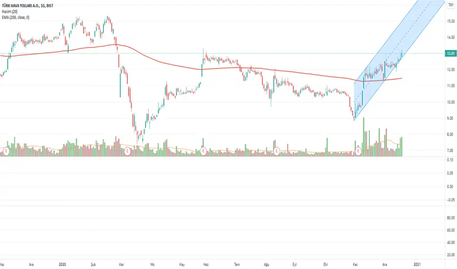 THYAO 02.Kasım'da başladığı yükselen kanal trendinde ısrarla kendini korumaya devam ediyor. Kanal alt desteğini tahtacılar o kadar güzel koruyarak tahtayı sürmeye devam ediyorlar. Yarın 12,83 desteğini koruyarak kapatması durumunda önümüzdeki haftaya grafik izlenerek taşınabilir izlenimi var. Kanalı korumaya devam ederse haftaya en alt hedefi 13,38 olur. Kanal alt çizgisi stop olarak kabul etmek şartıyla izlenebilir.