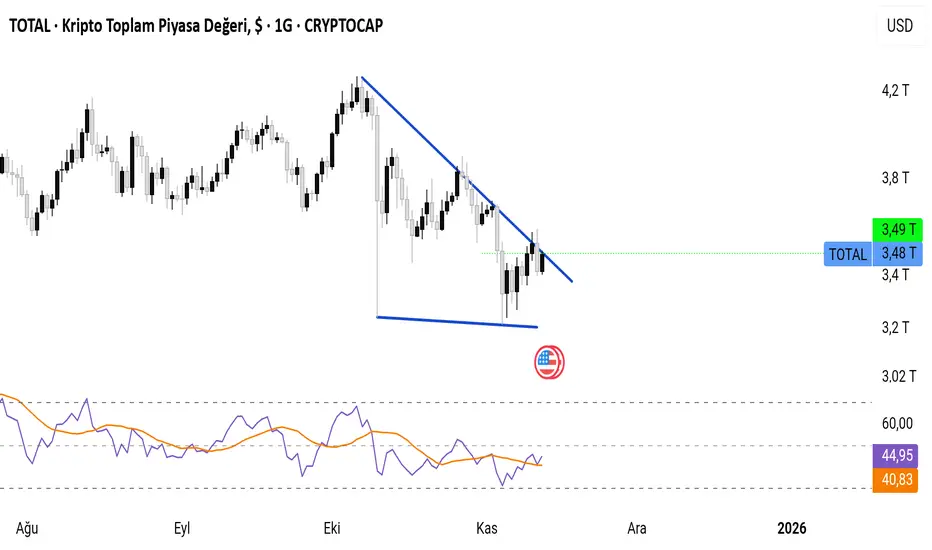 The market is forming a descending triangle — price keeps squeezing between lower highs and a strong support zone around $3.3T.