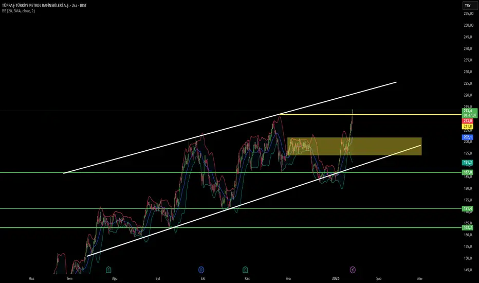 TÜPRAŞ hissesi, daha önce takip edilen onay bölgesini ve direnç seviyesini yukarı yönlü kırmayı başarmıştır. Bu kırılım sonrasında fiyatın yükseliş kanalının üst bandına doğru hareketini sürdürmesi beklenebilir.