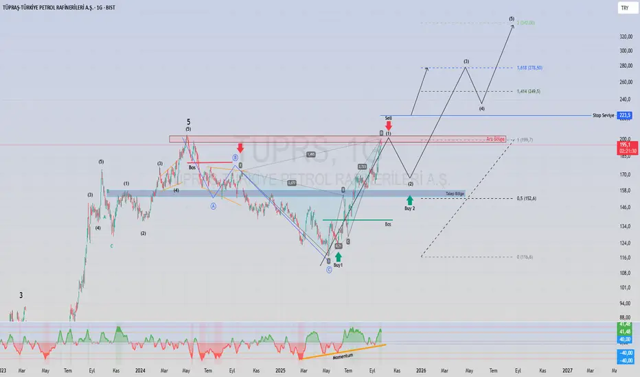 İşaretler/Onaylar: 223,5 üzerindeki günlük kapanış(lar), hacim desteği ve fiyatın önceki arz bölgesini (199–205) yukarı yönlü sağlam bir breakout ile onaylaması, 1. dalga uzaması yorumunu güçlendirir. Momentum göstergeleri pozitif ve makas açıyorsa (grafikte momentum pozitif eğilimde), bu senaryo olasılığını artırır.