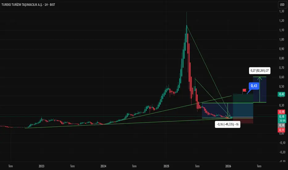 Bugün portföye ekleyeceğimiz bir başka hisse Tureks Turizm Taşımacılık (TUREX), Türkiye merkezli, özellikle toplu taşıma ve filo kiralama alanlarında uzmanlaşmış köklü bir ulaşım şirketidir. An itibari ile 8,15TL fiyat bandından işlem görmeye devam ettiğini görüyoruz. Teknik olarak incelediğimizde Ocak 2024 yılında başlayan yükseliş trendi 2025 mayıs ayına geldiğimizde 1,30$ zirvesini test ettiğini ve geçen zaman zarfından bu güne kadar kar satışlarının geldiğini görüyoruz.