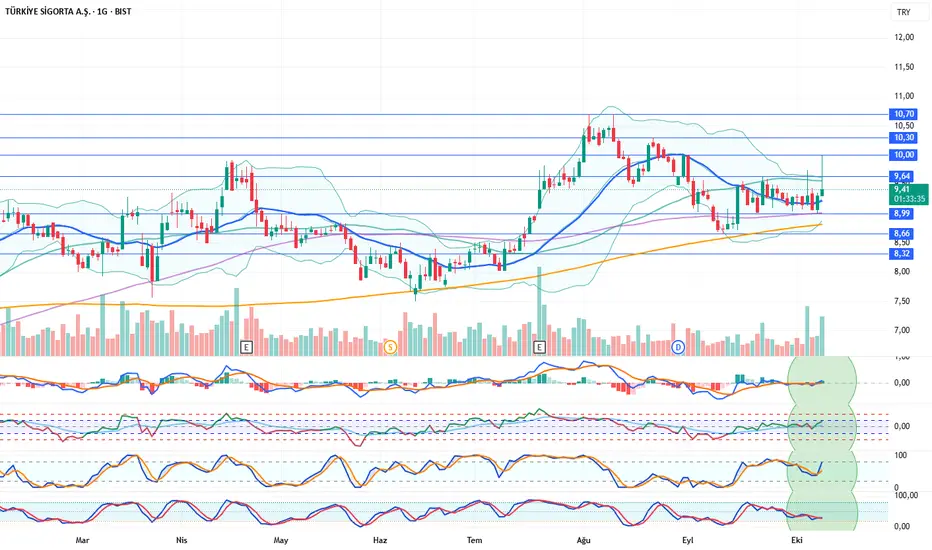 Günlük teknik indikatörler Pozitif. Hisse 21 günlük fiyat ortalamasının (9,22) üzerine çıkmış durumda. Gün içinde 10,00 tl ye kadar yükselen hisse bu seviyeyi koruyamayarak tekrar 9,64 direncinin altına inmiş gözüküyor. Hisse bugünkü pozitif hareketiyle indikatörlerini de pozitife çevirmiş ve sonraki günler için olumlu bir izlenim verdi diyebiliriz. Tabi destek devam eder ise tekrar 10,00 direncini test etme şansı yakalayabilir. Orta vade de 10,70 direnci takip edilecektir.