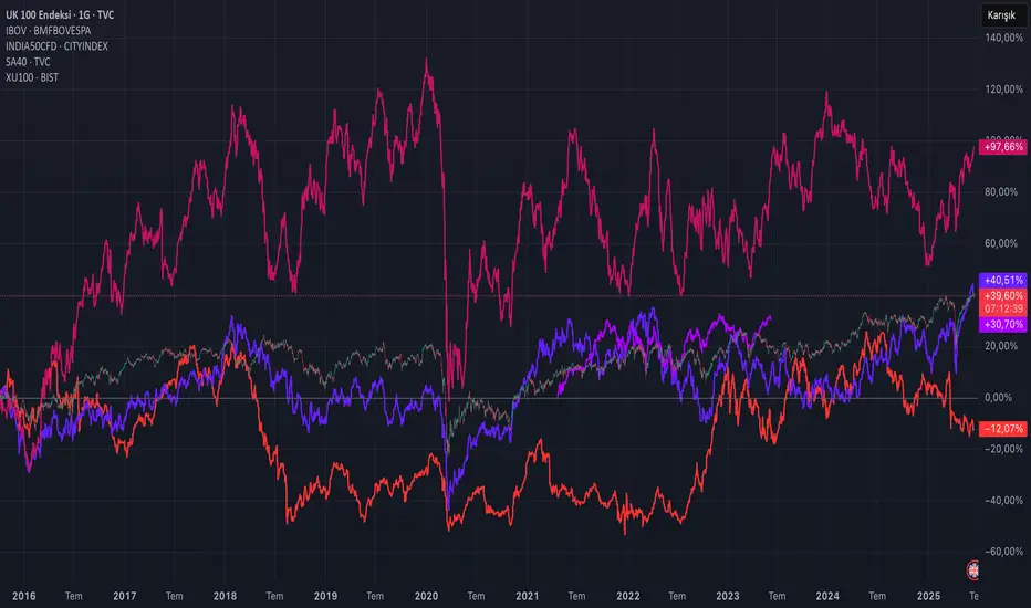 Bu grafikte UKX, IBOV, INDIA50CFD, SA40, XU100 gibi endeksler yer almaktadır. Portföyünüzü çeşitlendirmenin önemini vurgulamaktadır.
