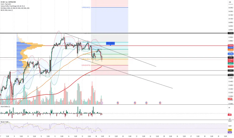 #US100 şu an 23.660 – 23.680 bandında işlem görüyor ve kısa vadeli alçalan kanal içinde hareket ediyor. Fiyat, Fibonacci %38,2 (23.683) desteğini test ediyor. Aşağı yönlü baskı güçlü, çünkü fiyat hem 20 hem de 50 periyotluk ortalamaların altında seyrediyor. RSI 33 seviyesinde, aşırı satıma yakın zayıf momentum gösteriyor. Bollinger alt bandına yaklaşması satış baskısının devam ettiğini teyit ediyor. Hacim tarafında kırmızı mumlarla desteklenen satış yoğunluğu dikkat çekiyor.