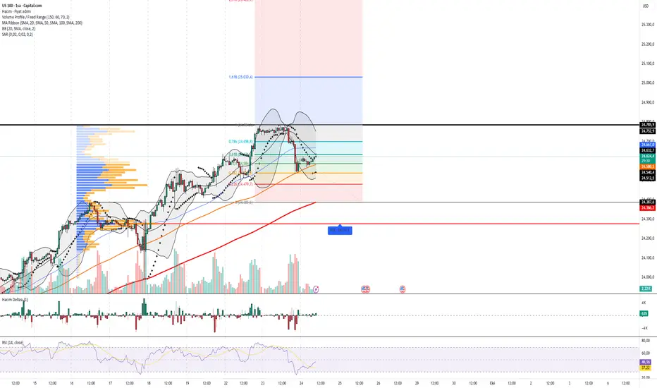 #US100 endeksi 24.800 seviyesinden gördüğü satış baskısıyla 24.500 bölgesine kadar geri çekildi. Şu an 24.600 civarında tutunmaya çalışıyor.