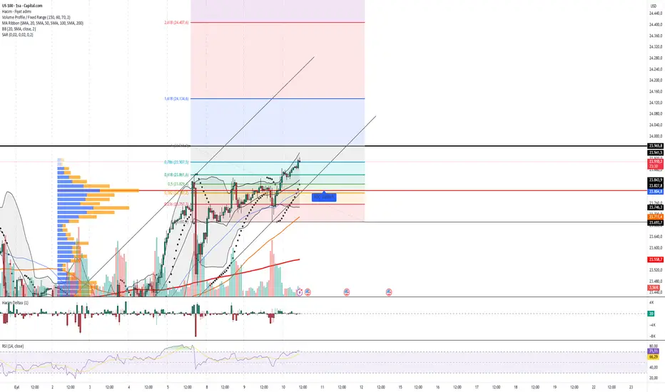 📌 ÖzetNasdaq (US100) kısa vadede güçlü yükseliş trendini sürdürüyor. 23.907 üzerinde kalıcılık sağlanırsa 24.134 ve 24.407 hedeflenebilir. Ancak RSI aşırı alımda olduğundan, 23.861 ve 23.805 desteklerine doğru kısa vadeli düzeltmeler görülebilir. Orta vadede trend yukarı yönlü, geri çekilmeler alım fırsatı yaratabilir.