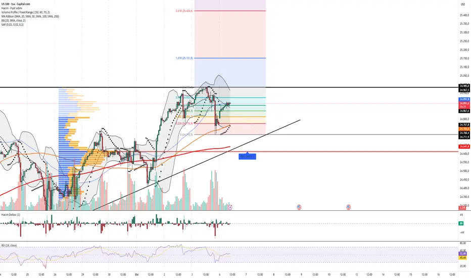 #US100 endeksi 24.900 civarında fiyatlanıyor. Fiyat, 25.000 psikolojik direncini birkaç kez test etmiş ancak üzerinde kalıcı olamamış durumda. Fibonacci %61,8 (24.949) seviyesi kritik dirençte ve fiyat burada sıkışıyor. Yükselen trend çizgisi korunuyor, ancak hacimde zayıflama var.